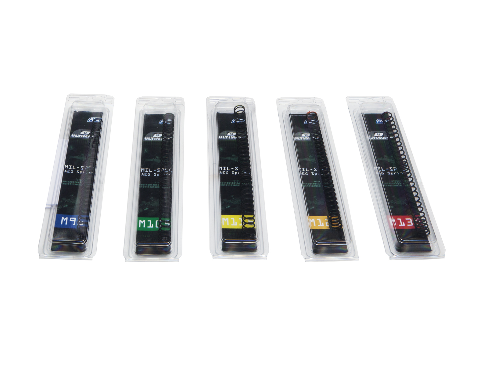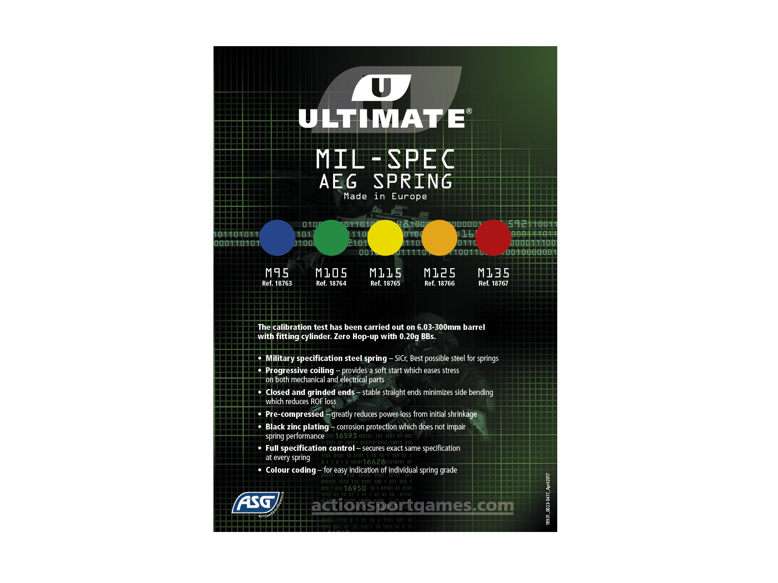 ActionSportGames Ultimate Upgrade Springs are manufactured from military grade steel for the best performance possible. Using SiCr grade steel allows Ultimate Springs to offer maximum power and consistency with every shot. Tightly coiled and ground spring ends and progressive coiling ensure that the Ultimate Spring remains correctly aligned and consistently compressed and released in your AEG regardless of the rate of fire – every time your AEG cycles. Each Ultimate Spring has been rigorously tested and pre-compressed, minimising power loss from initial compression found in competing brands. Each ASG Ultimate Spring has a convenient colour coded end so that you can see at a glance what power level you have selected. Available in M95 (blue) , M105 (green) , M115 (yellow), M125 (orange), and M135 (red)